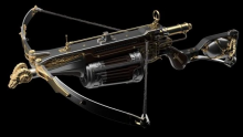 Grâce à son ingénieux système de poulies qui réduit considérablement l'effort à fournir pour la recharger, cette arbalète permet de tirer beaucoup plus souvent que le modèle traditionnel. Sa puissance en est légèrement réduite, surtout de loin, mais elle reste un formidable outil de mort, très populaire auprès des gardes, milices et autres conscrits qui n'ont pas nécessairement la musculature suffisante pour manier un arc de guerre. |